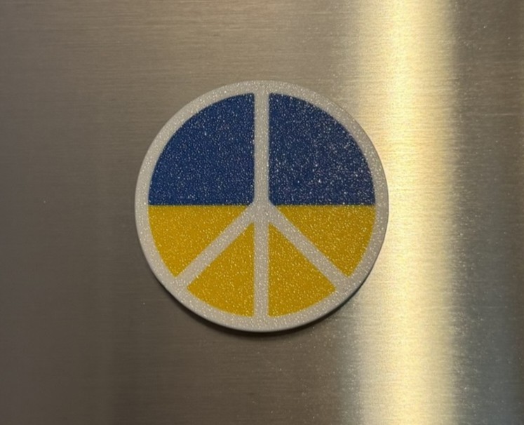 Der Kühlschrankmagnet Frieden für Ukraine ist so gestaltet, dass auf der Rückseite der eingedruckte Magnet 1,5 mm herausragt. Dadurch ist er leicht zu lösen, da er kippbar ist und man nicht lange mit den Fingern frickeln muss.