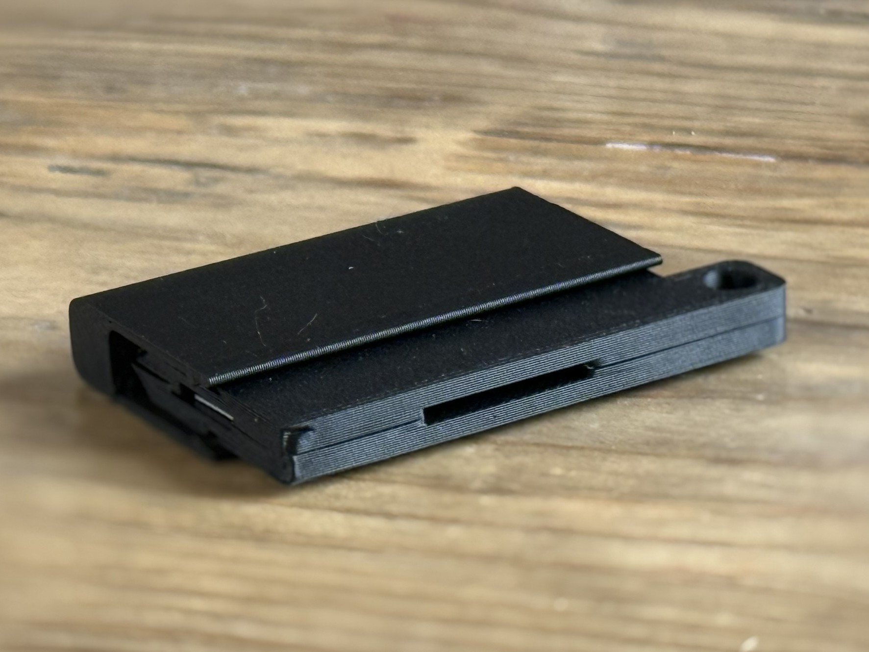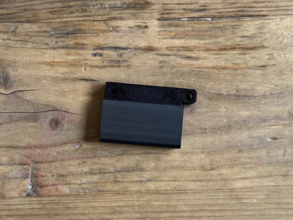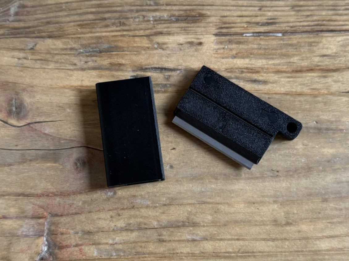 Der sCRAPer ist aus zwei Teilen zusammengesetzt, zwischen denen die handelsübliche Schaberklinge geklemmt ist. Die Klemmung ist sehr fest, um eine sichere Handhabung zu gewährleisten. Auf der Rückseite befindet sich ein Schlitz, mit dem unter Zuhilfenahme z.B. einer Messerspitze die beiden Hälften aufgehebelt werden können. Dabei kann es aufgrund der starken Klemmung passieren, dass die Verbindungselemente abbrechen. Dann ist der sCRAPer NICHT mehr zu verwenden!